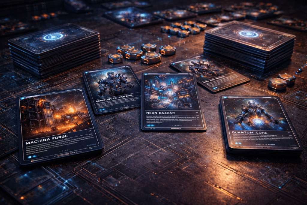 The Chrome Abyss: Hybrid Uprising is a competitive deck-building card game where players assemble and evolve their decks over time. Cards represent characters, abilities, territories, augments, missions and events — each one a fragment of the larger world.